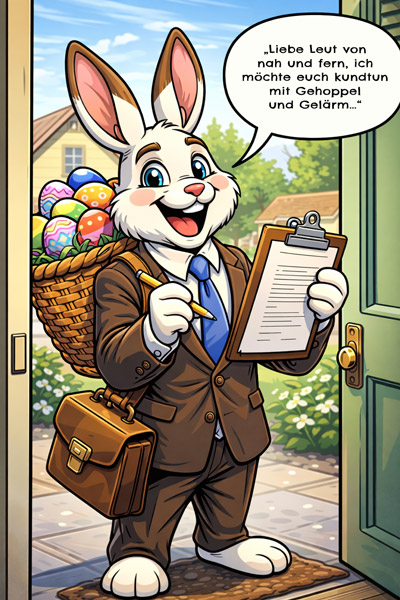 In der Hoffnung, dass es die Lieferung meiner sehnlichst erwarteten Ohrmuschelwärmer sind, die mir seit Tagen auf dem Handy als Werbung eingespielt wird, sprinte ich an die Tür. Doch da steht ein langohriges etwas mit langen Zähnen – ist das ein Säbelzahnhase? Er stellt sich als Osterhase vor, der heute in der heiligen Mission, des Laiseacker unterwegs ist und hat folgendes zu verkünden…