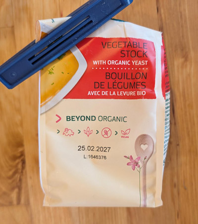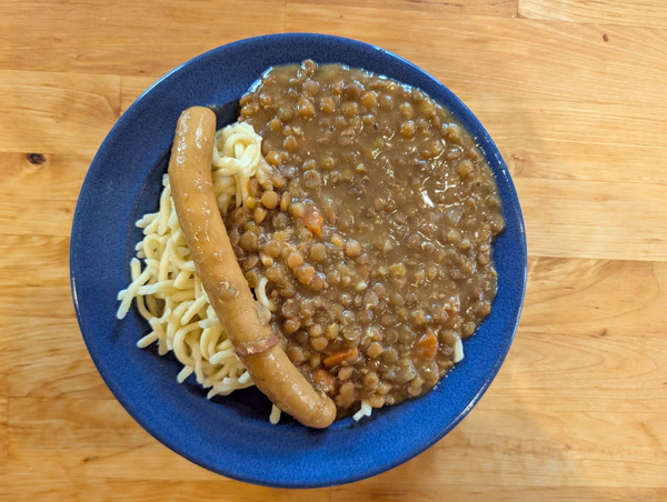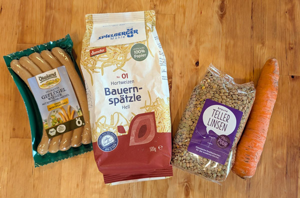 Das geht schief, ich muss die Kinder fragen, wie es in der Schule war und Interesse zeigen. Zwei Minuten to go, ich schalte den Linsenherd aus und lasse langsam Druck ab, das dauert aber leider oder die Küche ist mit Linsenbreigeschossen aus dem Überdruckventil gepflastert. Die Spätzle sind bissfest, also abgießen. Ok, ich bin leicht im Verzug aber der Deckel ist offen, Konsistenz Topp aber völlig fad, Linsen sollte man immer erst nach dem Kochen würzen, sonst dauert das noch länger. Ich verwende ein bisschen Pfeffer und mein Allheilmittel für alle Suppen, Soßen und Dinge, die ich deftig lecker würzen möchte – die Gemüsebrühe von Naturata. Umrühren und entweder Geflügelwiener, normale oder eine vegane Ausführung schnell in den Topf gegen zum Erwärmen und Tataa, fertig ist das Linsengericht.