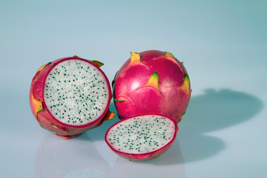 Die Drachenfrucht oder auch Pitaya genannt sieht zwar aus wie ein Drachenei mit Schuppen, gehört aber zur Gattung der Kakteen. Unter der leuchtend, bunten Schale befindet sich das (meist) weiße Fruchtfleisch das von vielen kleinen schwarzen Kernen durchzogen ist.