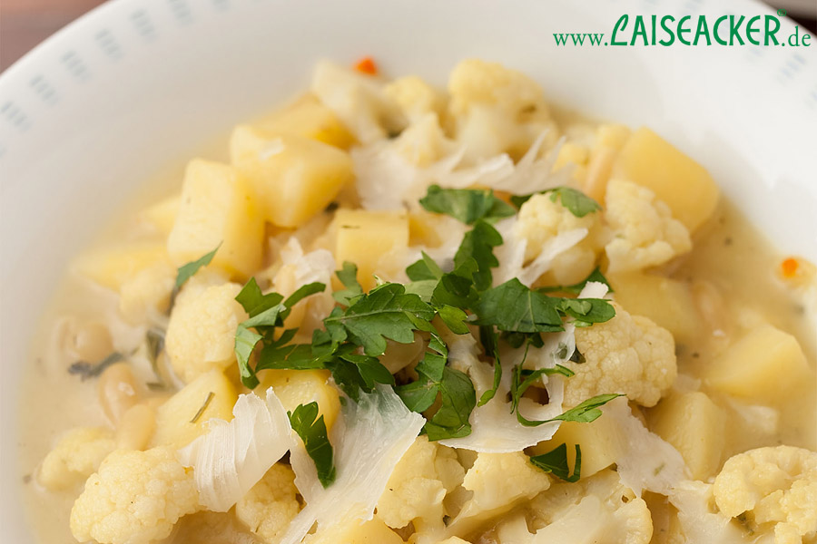 Blumenkohl und Pinienkerne dazugeben, mit der übrigen Brühe auffüllen und weitere 5 min. einkochen.