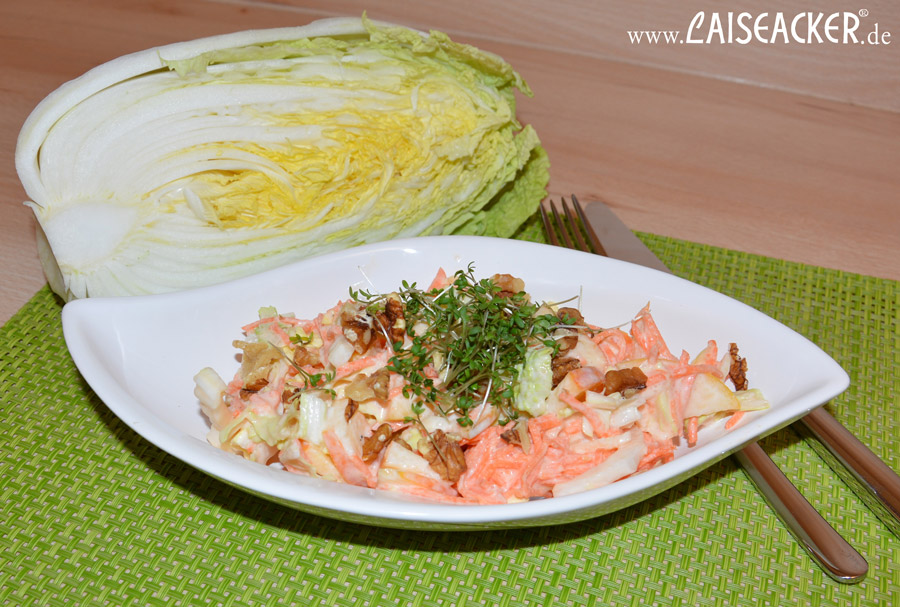 • Chinakohl, Apfelstücke und Möhrenraspeln zum Dressing geben, alles gut mischen und ca. 30 Minuten ziehen lassen.