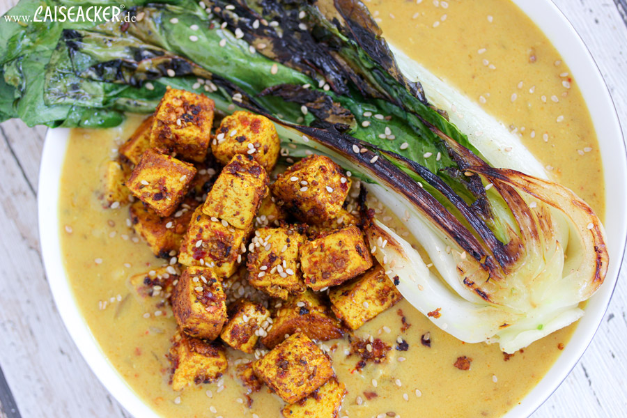 - In einem Teller die Sauce anrichten und den Pak Choi darauflegen. Die gebratenen Tofüwürfel dazugeben und alles mit etwas Sesam verfeinern.