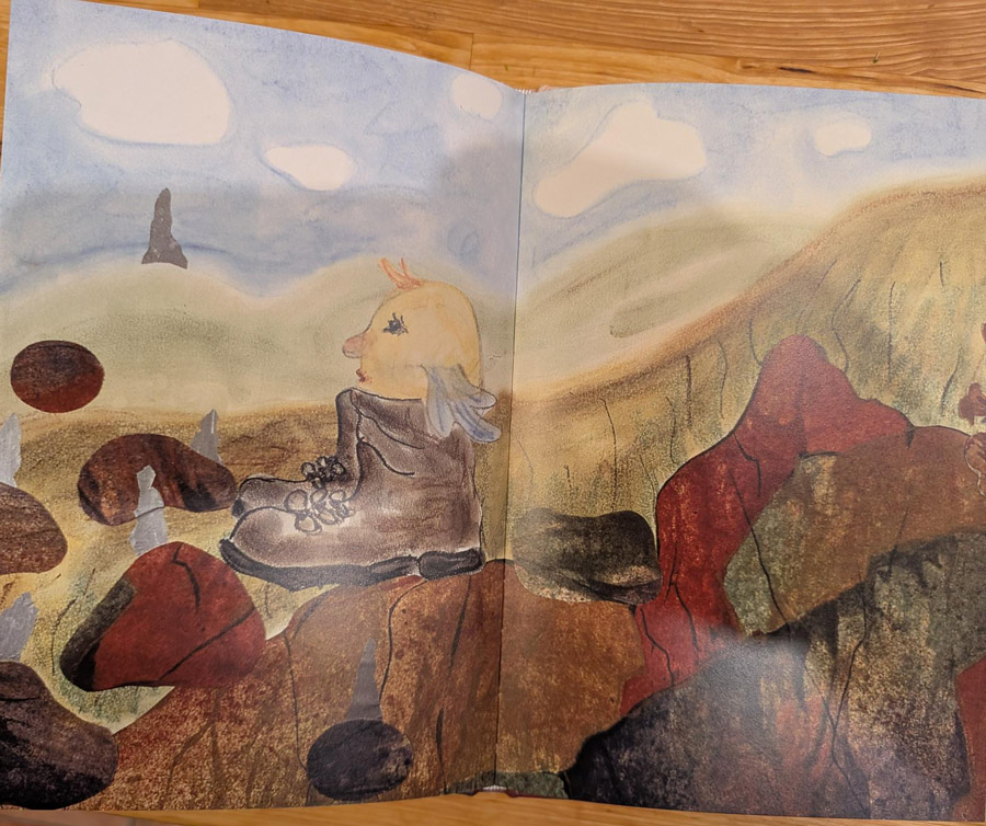 ein Bilderbuch für Erwachsene die mit den Flügeln schlagen möchten. Mich erinnert es an die grafische Umsetzung der „Blue Meanies“ aus dem Beatles Film „Yellow Submarine“ nur mit helleren, freundlicheren Erdtönen. Wenig Text lässt den Bildern sehr viel Raum zum Atmen…